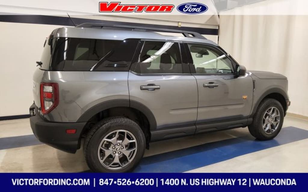 CARFAX One-Owner. Clean CARFAX. Carbonized Gray Metallic 2023 Ford Bronco Sport Badlands 4WD 8-Speed Automatic EcoBoost 2.0L I4 GTDi DOHC Turbocharged VCT 3.80 Axle Ratio, 4-Wheel Disc Brakes, 4G LTE Wi-Fi Hotspot Credit, ABS brakes, Air Conditioning, Alloy wheels, AM/FM radio: SiriusXM, AM/FM Stereo, Auto High-beam Headlights, Auto-Dimming Rear-View Mirror, Automatic temperature control, B & O Sound System by Bang & Olufsen w/HD Radio, Body-Colored Door Handles, Brake assist, Cargo Mat, Compass, Delay-off headlights, Driver door bin, Driver vanity mirror, Dual front impact airbags, Dual front side impact airbags, Dual-Zone Electronic Automatic Temperature Control, Electronic Stability Control, Emergency communication system: SYNC 3 911 Assist, Equipment Group 400A, Evasive Steering Assist, Ford Co-Pilot360 Assist+, Four wheel independent suspension, Front & Rear Floor Liners w/Carpet Mats, Front anti-roll bar, Front Bucket Seats, Front Center Armrest, Front fog lights, Front reading lights, Fully automatic headlights, HD Radio, Heated door mirrors, Heated front seats, Heated Steering Wheel, Illuminated entry, Intelligent Adaptive Cruise Control w/Stop & Go, Knee airbag, Leather-Trimmed Heated Sport Contour Bucket Seats, Low tire pressure warning, Memory Driver's Seat & Sideview Mirror, Occupant sensing airbag, Outside temperature display, Overhead airbag, Overhead console, Panic alarm, Passenger door bin, Passenger vanity mirror, Power door mirrors, Power driver seat, Power Moonroof, Power steering, Power windows, Premium Package, Radio data system, Rear anti-roll bar, Rear Parking Sensors, Rear reading lights, Rear seat center armrest, Rear window defroster, Rear window wiper, Remote keyless entry, Remote Start System, Security system, SiriusXM, Speed control, Speed-sensing steering, Speed-Sensitive Wipers, Split folding rear seat, Steering wheel mounted audio controls, SYNC 3 Communications & Entertainment System, SYNC 3/Apple CarPlay/Android Auto, Tachometer, Telescoping steering wheel, Tilt steering wheel, Traction control, Trip computer, Unique Style Cloth Htd Sport Contour Bucket Seats, Universal Garage Door Opener (UGDO), Variably intermittent wipers, Voice-Activated Touchscreen Navigation System, Wheels: 17" Carbonized Gray-Painted Aluminum, Wireless Charging Pad.