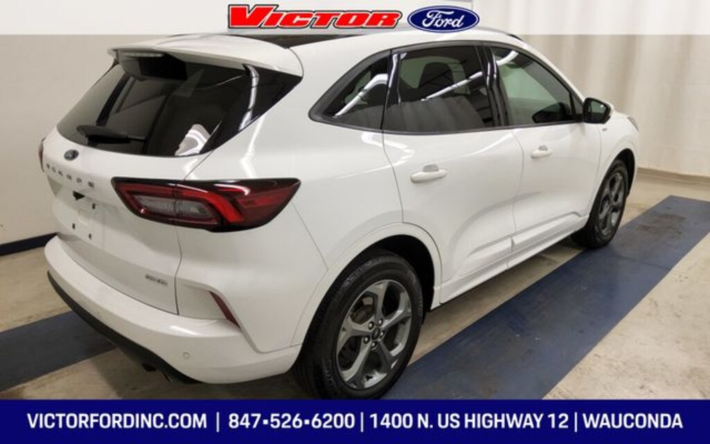 Clean CARFAX. Oxford White 2023 Ford Escape ST-Line Select AWD 8-Speed Automatic EcoBoost 2.0L I4 GTDi DOHC Turbocharged VCT 10-Way Power Driver's Seat, 12.3" Productivity Screen in Instrument Cluster, 2.91 Axle Ratio, 360-Degree Camera w/Split View, 4-Wheel Disc Brakes, 6 Speakers, 6-Way Power Passenger Seat, ABS brakes, Alloy wheels, AM/FM radio: SiriusXM, AM/FM Stereo, Auto High-beam Headlights, Black Roof-Rack Side Rails, Body Color Mirrors, Brake assist, Bumpers: body-color, Compass, Connected Built-In Navigation, Delay-off headlights, Driver door bin, Driver vanity mirror, Dual front impact airbags, Dual front side impact airbags, Electronic Fuel Door Release, Electronic Stability Control, Emergency communication system: SYNC 4 911 Assist, Equipment Group 401A, Exterior Parking Camera Rear, Ford Co-Pilot360 Assist 2.0, FordPass Connect, Four wheel independent suspension, Front & Rear Floor Liners w/Carpet Mats, Front anti-roll bar, Front Bucket Seats, Front Center Armrest, Front fog lights, Front reading lights, Fully automatic headlights, HD Radio, Heated door mirrors, Heated front seats, Heated steering wheel, Heated Vinyl/Cloth Front Sport Contour Bucket Seats, Illuminated entry, Intelligent Adaptive Cruise Control w/Stop-and-Go, Intersection Assist, Knee airbag, Low tire pressure warning, Memory Package, Neutral Towing Capability, Occupant sensing airbag, Outside temperature display, Overhead airbag, Overhead console, Panic alarm, Panoramic Vista Roof, Passenger door bin, Passenger vanity mirror, Pedestrian Alert Sounder, Power door mirrors, Power driver seat, Power Liftgate, Power steering, Power windows, Radio data system, Radio: B&O Sound System by Bang & Olufsen, Rear anti-roll bar, Rear Parking Sensor, Rear reading lights, Rear seat center armrest, Rear window wiper, Remote keyless entry, Reverse Brake Assist, SecuriCode Keyless Entry Keypad, Speed control, Speed Sign Recognition, Speed-sensing steering, Speed-Sensitive Wipers, Split folding rear seat, Spoiler, Sport steering wheel, Steering wheel mounted audio controls, SYNC 4, SYNC 4 w/Enhanced Voice Recognition, Tachometer, Tech Pack #2, Telescoping steering wheel, Tilt steering wheel, Traction control, Trip computer, Variably intermittent wipers, Wheels: 18" Rock Metallic Painted Aluminum, Wireless Charging Pad.