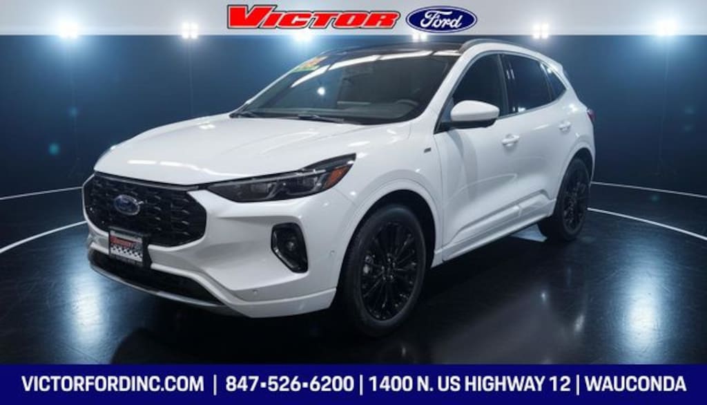 CARFAX One-Owner. Clean CARFAX. White Metallic 2023 Ford Escape ST-Line Elite AWD 8-Speed Automatic EcoBoost 2.0L I4 GTDi DOHC Turbocharged VCT **ORIGINAL MSRP $44,645 **, 2.91 Axle Ratio, 4-Wheel Disc Brakes, 6 Speakers, ABS brakes, Active Park Assist 2.0, Air Conditioning, Alloy wheels, AM/FM radio: SiriusXM, AM/FM Stereo, Auto High-beam Headlights, Auto-dimming Rear-View mirror, Automatic temperature control, Black Roof-Rack Side Rails, Brake assist, Bumpers: body-color, Class II Trailer Tow Package, Compass, Delay-off headlights, Driver door bin, Driver vanity mirror, Dual front impact airbags, Dual front side impact airbags, Electronic Fuel Door Release, Electronic Stability Control, Emergency communication system: SYNC 4 911 Assist, Equipment Group 501A, Exterior Parking Camera Rear, FordPass Connect, Four wheel independent suspension, Front anti-roll bar, Front Bucket Seats, Front Center Armrest, Front dual zone A/C, Front fog lights, Front reading lights, Fully automatic headlights, Garage door transmitter, HD Radio, Head-Up Display, Heated door mirrors, Heated front seats, Heated Leather-Trimmed Front Sport Contour Seats, Heated steering wheel, Heated Vinyl/Cloth Front Sport Contour Bucket Seats, Illuminated entry, Knee airbag, Low tire pressure warning, Memory seat, Navigation system: Connected Navigation, Neutral Towing Capability, Occupant sensing airbag, Outside temperature display, Overhead airbag, Overhead console, Panic alarm, Panoramic Vista Roof, Passenger door bin, Passenger vanity mirror, Pedestrian Alert Sounder, Power door mirrors, Power driver seat, Power Liftgate, Power passenger seat, Power steering, Power windows, Premium Technology Package, Radio data system, Radio: B&O Sound System by Bang & Olufsen, Rain sensing wipers, Rear anti-roll bar, Rear reading lights, Rear seat center armrest, Rear window defroster, Rear window wiper, Remote keyless entry, Security system, Speed control, Speed-sensing steering, Speed-Sensitive Wipers, Split folding rear seat, Spoiler, Sport steering wheel, Steering wheel mounted audio controls, SYNC 4 w/Enhanced Voice Recognition, Telescoping steering wheel, Tilt steering wheel, Traction control, Trip computer, Variably intermittent wipers, Wheels: 19" Ebony-Painted Aluminum.