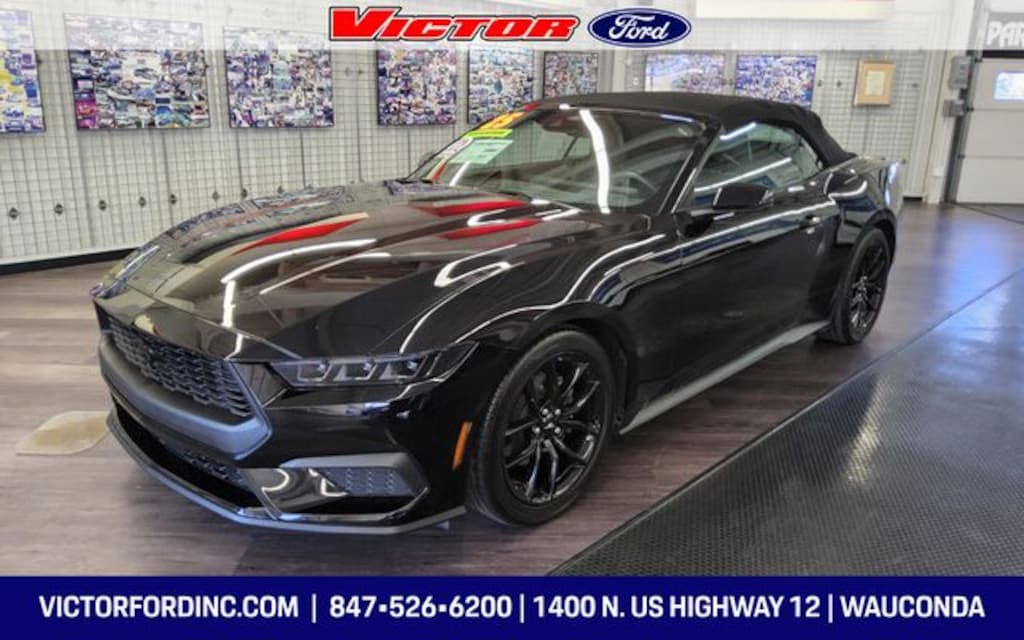 CARFAX One-Owner. Clean CARFAX. Shadow Black 2025 Ford Mustang EcoBoost Premium RWD 10-Speed Automatic EcoBoost 2.3L I4 GTDi DOHC Turbocharged VCT **ORIGINAL MSRP $49,650**, 4-Wheel Disc Brakes, 9 Speakers, ABS brakes, Active Anti-Theft System, Adaptive Cruise Control w/Stop & Go, Air Conditioning, Alloy wheels, AM/FM radio: SiriusXM with 360L, AM/FM Stereo, Auto High-beam Headlights, Automatic temperature control, Black Front & Rear Pony Badges, Black Mirror Caps, Brake assist, Compass, Connected Navigation, Convertible roof lining, Delay-off headlights, Driver door bin, Driver Seat & Mirrors Memory, Driver vanity mirror, Dual front impact airbags, Dual front side impact airbags, Electronic Stability Control, Emergency communication system: 911 Assist, Equipment Group 201A High Package, Exterior Parking Camera Rear, Ford Co-Pilot360 Assist+, Four wheel independent suspension, Front anti-roll bar, Front Bucket Seats, Front Center Armrest, Front dual zone A/C, Front reading lights, Fully automatic headlights, Glass rear window, HD Radio, Headlamps w/Black Bezels, Heated front seats, Heated steering wheel, Illuminated Door-Sill Scuff Plates, Illuminated entry, Integrated Turn Signals, Internet access capable: FordPass Connect, Knee airbag, Lane-Keeping System w/Lane Keeping Aid, Leather Shift Knob, Leather-Trimmed Bucket Seats w/Color Accents, Locking Center Console, Low tire pressure warning, Mustang Nite Pony Package, Occupant sensing airbag, Outside temperature display, Overhead console, Panic alarm, Passenger door bin, Passenger vanity mirror, Power convertible roof, Power driver seat, Power passenger seat, Power steering, Power windows, Pre-Collision Assist w/Automatic Emergency Braking, Premium Floor Liners Front & Rear (w/Carpet Mats), Radio data system, Rain sensing wipers, Rear anti-roll bar, Rear Parking Sensors, Rear window defroster, Remote keyless entry, Security Package, Security system, Shadow Black Blade Decklid Spoiler, SiriusXM w/360L, Speed control, Speed-sensing steering, Speed-Sensitive Wipers, Sport steering wheel, Steering wheel mounted audio controls, SYNC 4, Tachometer, Telescoping steering wheel, Tilt steering wheel, Traction control, Trip computer, Universal Garage Door Opener (UGDO), Variably intermittent wipers, Voltmeter, Wheels: 19" x 8.5" Ebony Black-Painted Aluminum.